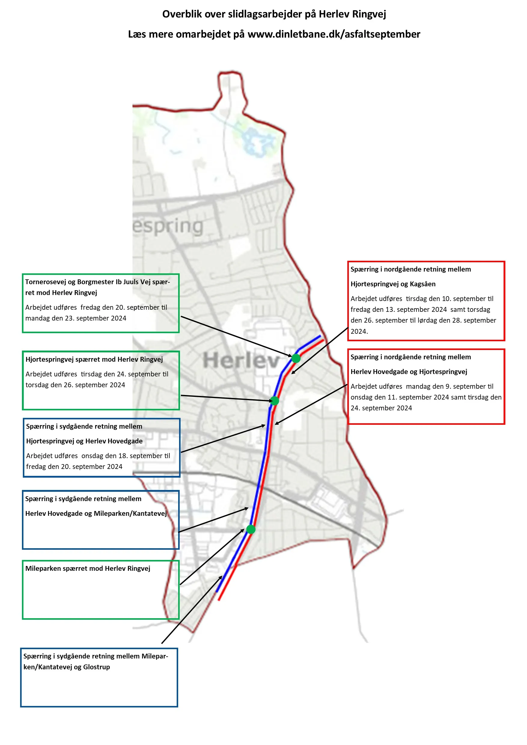 Som noget af det sidste, skal der udlægges slidlag på hele Herlev Ringvej. For at opnå det bedste resultat udføres arbejdet i større områder ad gangen. Dette arbejde er planlagt udført i september 2024. Arbejdet starter i det østlige kørespor (retning mod Gladsaxe) i Rødovre Kommune og ved kommunegrænsen til Gladsaxe Kommune fortsætter arbejdet i vestlige spor (retning mod Glostrup). Krydsene ved Kantatevej/Mileparken og Herlev Hovedgade samt Hjortespringvej/Tornerosevej og Borgmester Ib Juuls Vej/Tornerosevej planlægges udført i weekender. Det er Hovedstadens Letbane og deres entreprenør som udfører arbejdet. Du kan læse mere om disse arbejder og hvilken betydning arbejdet har for trafikken på www.dinletbane.dk/asfaltseptember