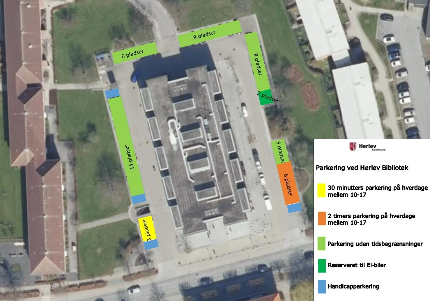 De øvrige parkeringspladser rundt om Herlev Bibliotek er uden tidsbegrænsning.