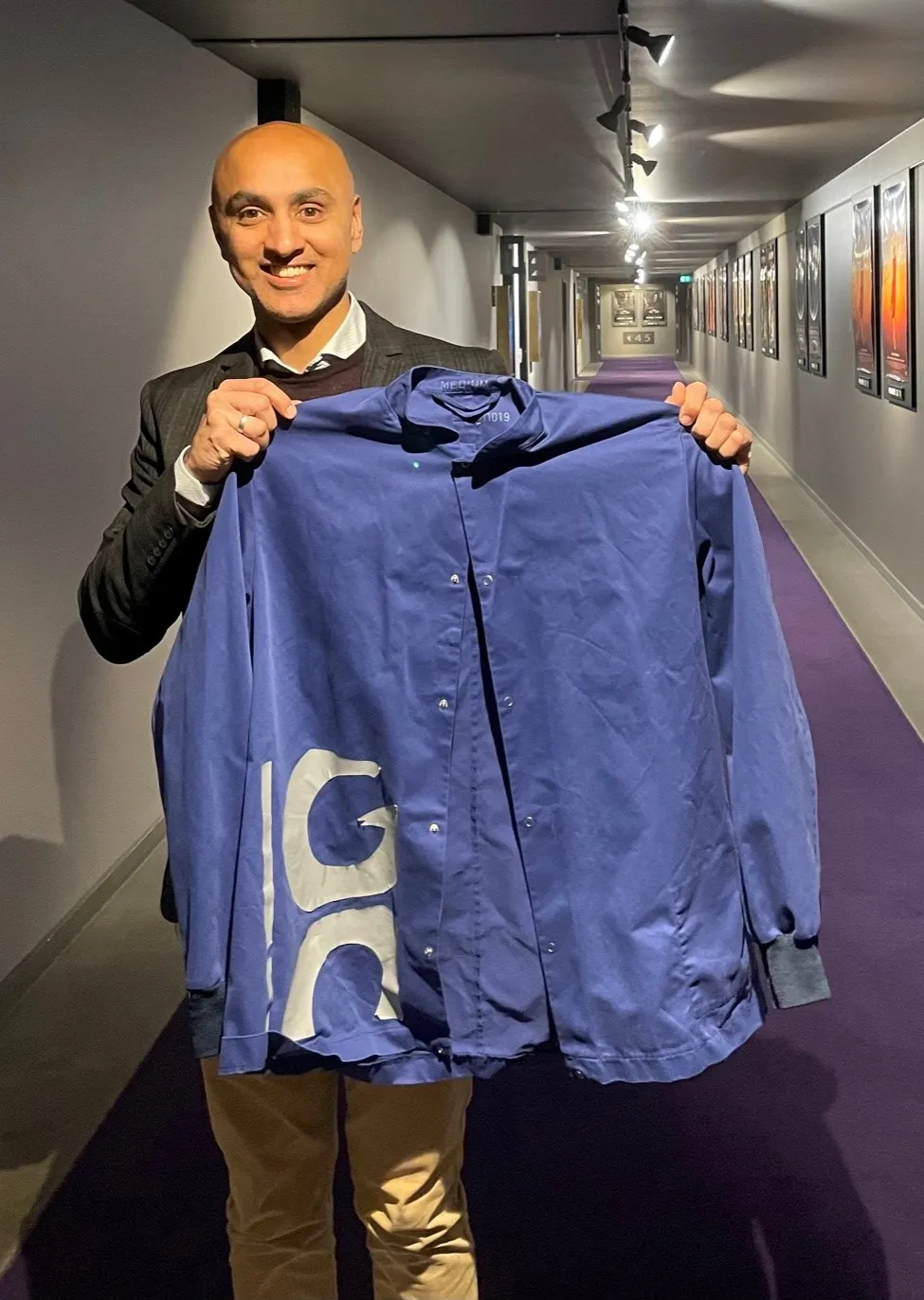 Biografchef Farukh Olskær Saghir med en af personalets uniformer, som er fremstillet af rest-tekstiler fra De Forenede Dampvaskerier.